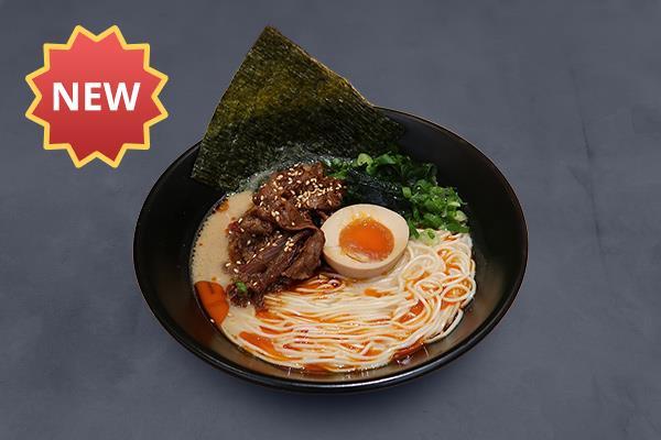 The Spicy Yakiniku Tonkotsu Ramen features springy ramen noodles simmered in a rich and creamy tonkotsu broth topped with tender spicy beef yakiniku, wakame, spring onions, tempura flake, and ajitama egg.